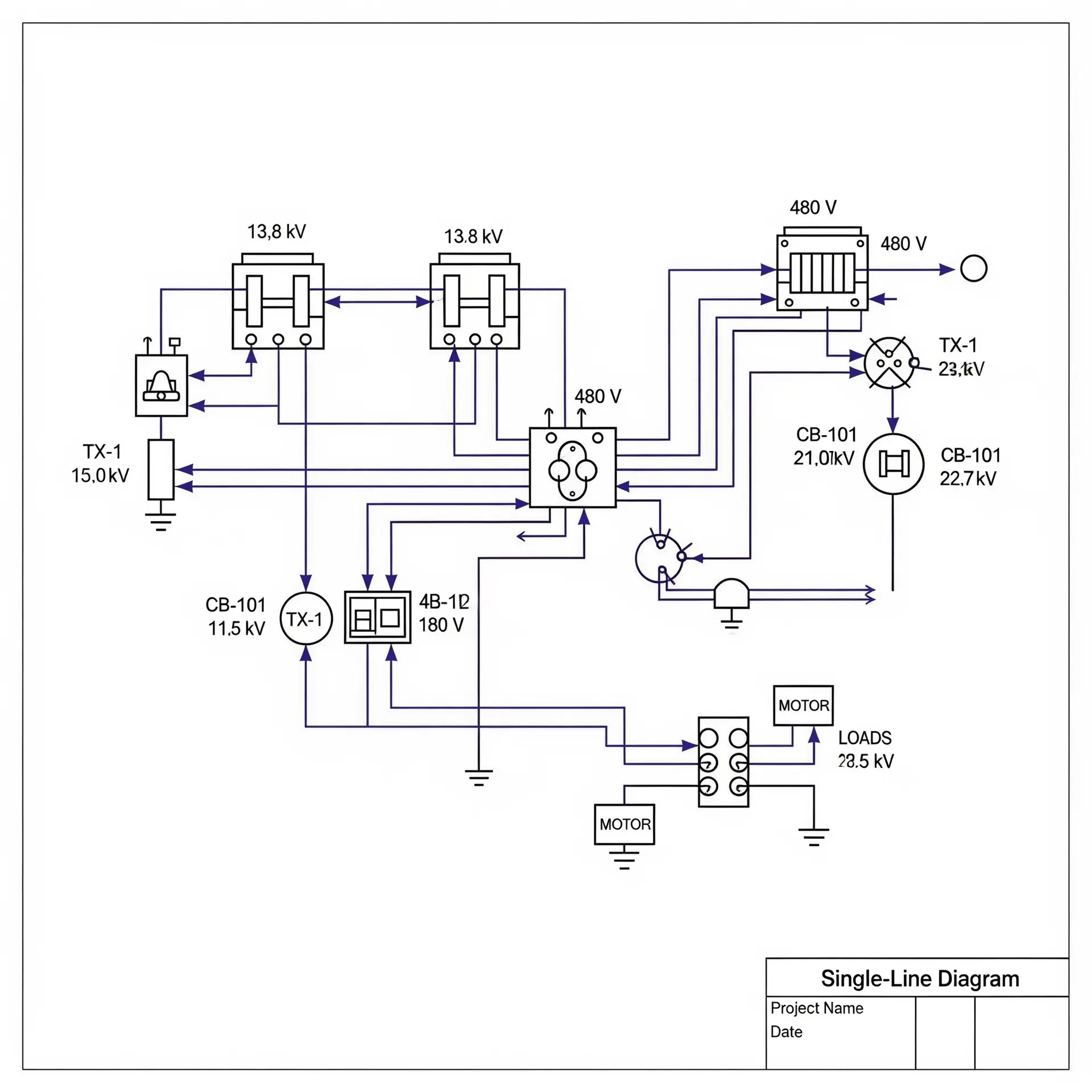 An Electrical One-Line Diagram (also called a Single-Line or SLD) is a simplified, high-level schematic that shows how power flows through your facility. It uses standardized symbols to represent major components such as transformers, switchgear, circuit breakers, loads (motors, HVAC, lighting), and protective devices – connected by lines that indicate conductors or busbars. Instead of showing every wire or detail, a one-line diagram offers a clean, consolidated view of your power distribution network, designed for clarity and usability.