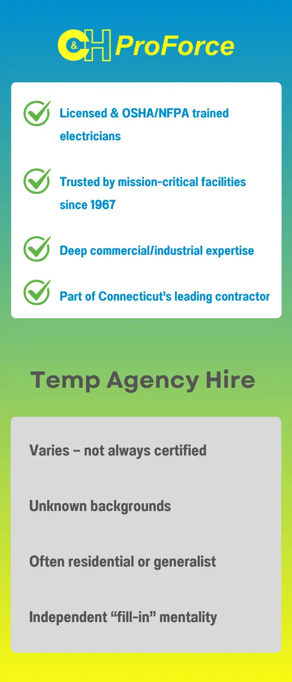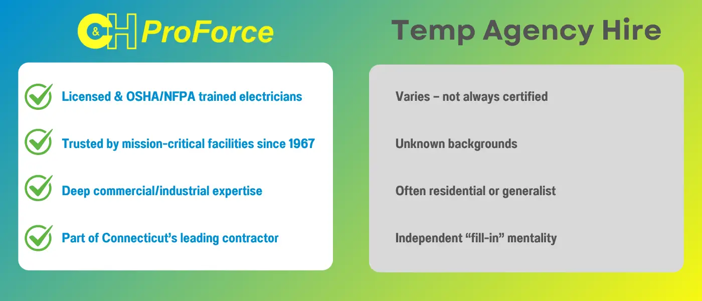 Whether it’s unexpected turnover, planned vacations, or urgent project needs, C&H ProForce provides immediate access to our highly skilled, licensed electricians.